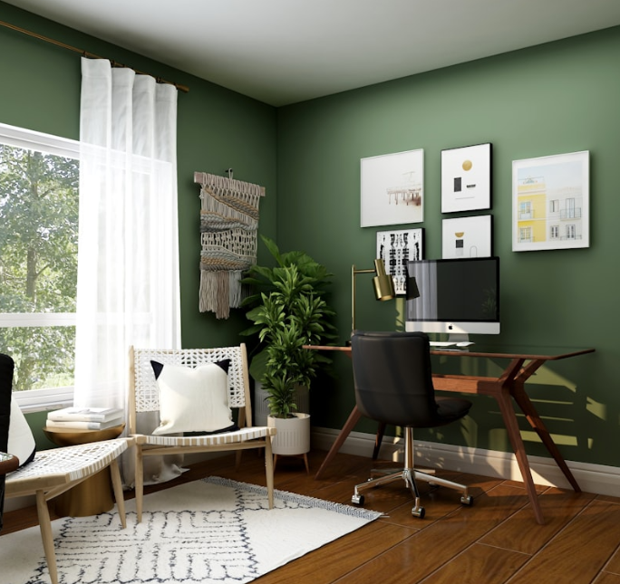 Home office with desk, computer, comfortable seating, and natural light—ideal for remote work during a winter stay in San Antonio.